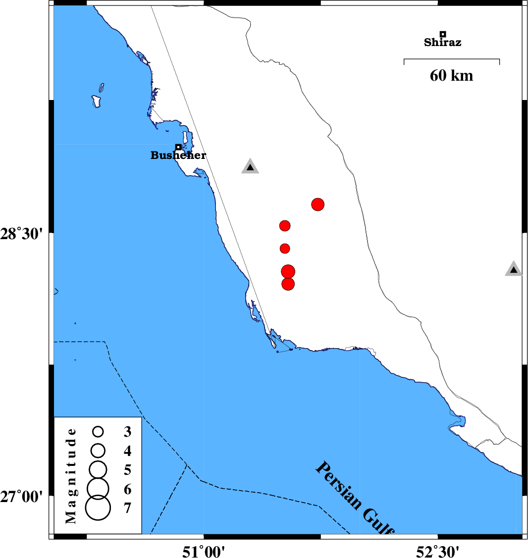 | 2013/05/30 | 03:19:48.1 | 07:49:48.1 | 28.21 | 51.54 | 25 | ML:3.7 | Bushehr Province, 52 km South-East of Khormog | ||