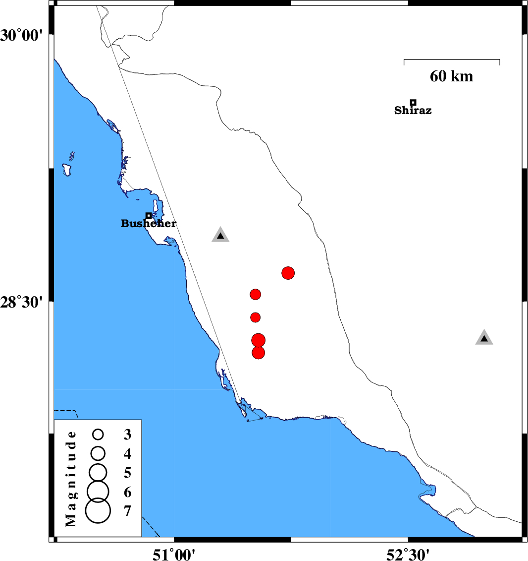 | 2013/05/30 | 15:20:30.1 | 19:50:30.1 | 28.54 | 51.52 | 18 | ML:3.1 | Bushehr Province, 19 km South-East of Khormog | ||
