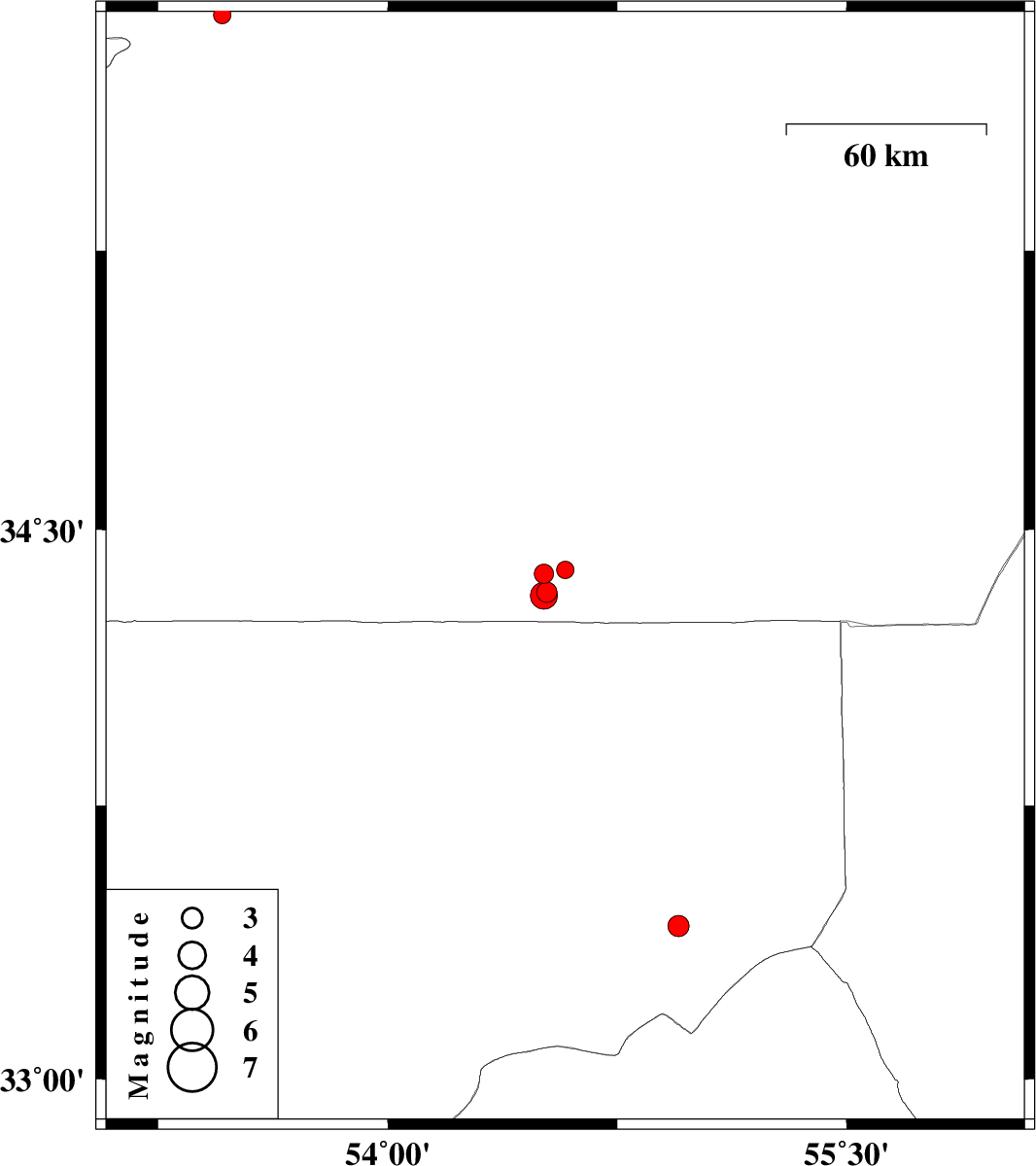 | 2013/05/07 | 20:23:00.3 | 00:53:00.3 | 34.32 | 54.51 | 14 | ML:4 | Semnan Province, 206 km South-East of Damghan |