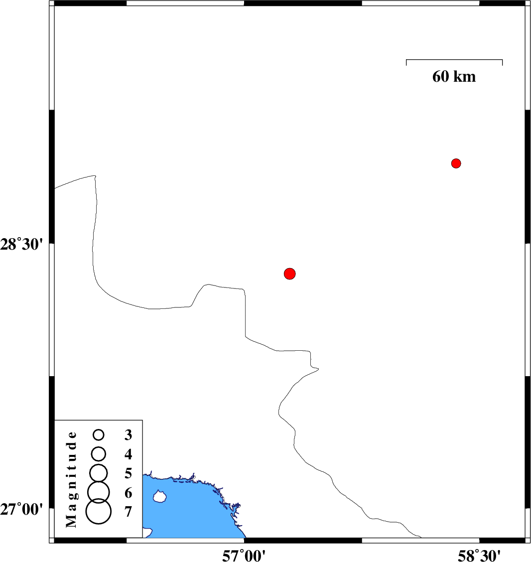 | 2013/06/01 | 02:02:27.7 | 06:32:27.7 | 28.95 | 58.35 | 14 | ML:2.7 | Kerman Province, 18 km South of Bam |