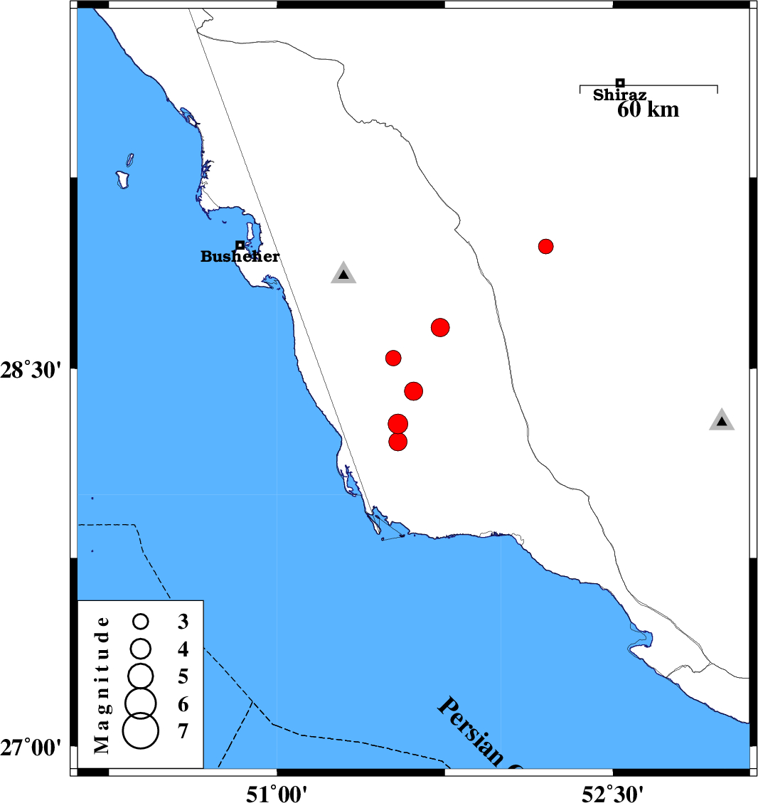 | 2013/05/30 | 15:20:30.1 | 19:50:30.1 | 28.54 | 51.52 | 18 | ML:3.1 | Bushehr Province, 19 km South-East of Khormog | ||