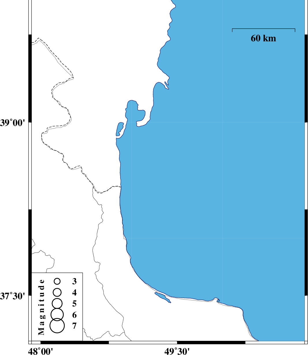 | 2013/06/04 | 19:58:19.1 | 00:28:19.1 | 38.6 | 49.4 | 14 | ML:3.2 | Caspian Sea, 51 km North-East of Astara |