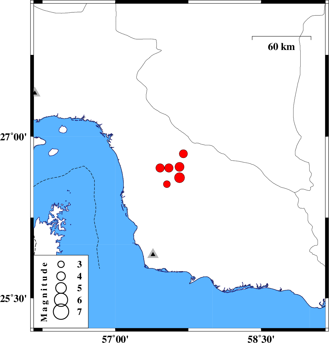 | 2013/05/30 | 05:19:39.8 | 09:49:39.8 | 26.56 | 57.53 | 8 | ML:3.2 | Hormozgan Province, 95 km South of Manujan |