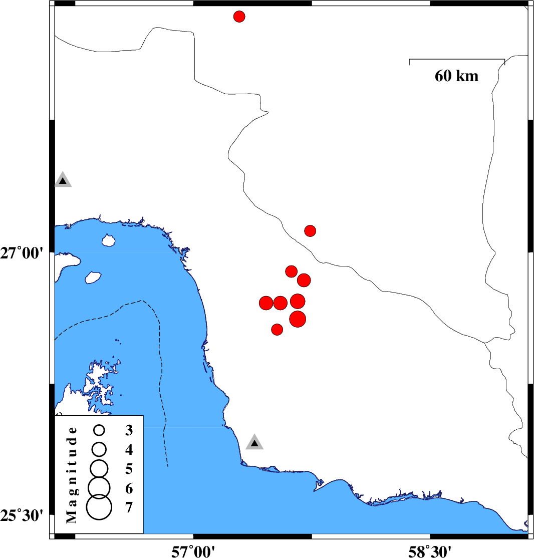 | 2013/05/30 | 05:19:39.8 | 09:49:39.8 | 26.56 | 57.53 | 8 | ML:3.2 | Hormozgan Province, 95 km South of Manujan |