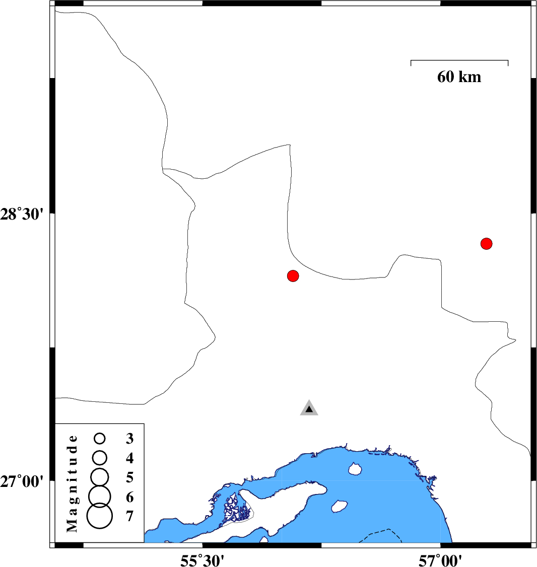 | 2013/06/07 | 19:06:14.2 | 23:36:14.2 | 28.15 | 56.07 | 14 | ML:3.2 | Hormozgan Province, 24 km South-East of Hajiabad | ||