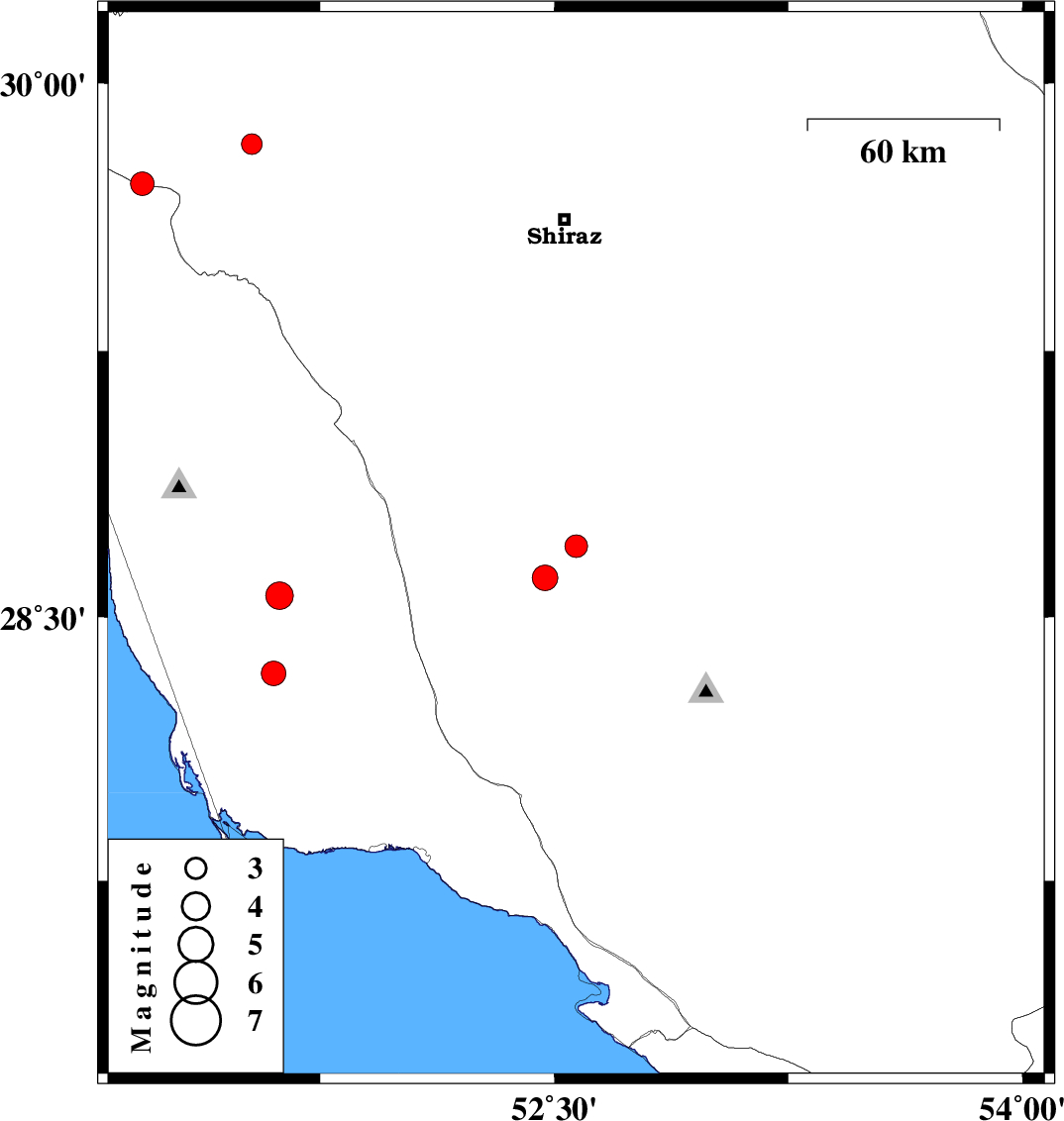 | 2013/06/07 | 10:48:30.0 | 15:18:30.0 | 29.72 | 51.18 | 43 | ML:3.4 | Fars Province, 51 km North of Borazjan | ||