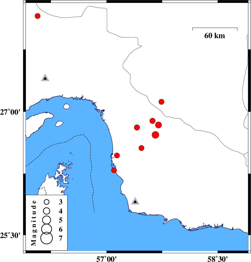 | 2013/06/12 | 06:35:05.7 | 11:05:05.7 | 26.29 | 57.1 | 15 | ML:3.2 | Oman Sea, 96 km South of Minab | ||
