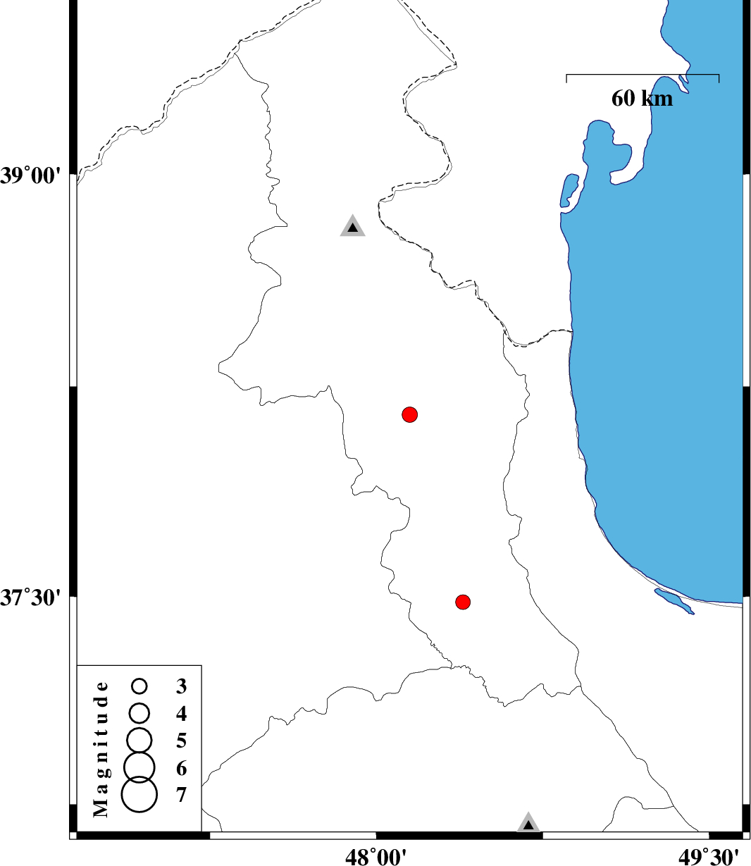 | 2013/06/11 | 04:33:37.9 | 09:03:37.9 | 37.48 | 48.39 | 14 | ML:2.9 | Ardebil Province, 24 km South of Givi |
