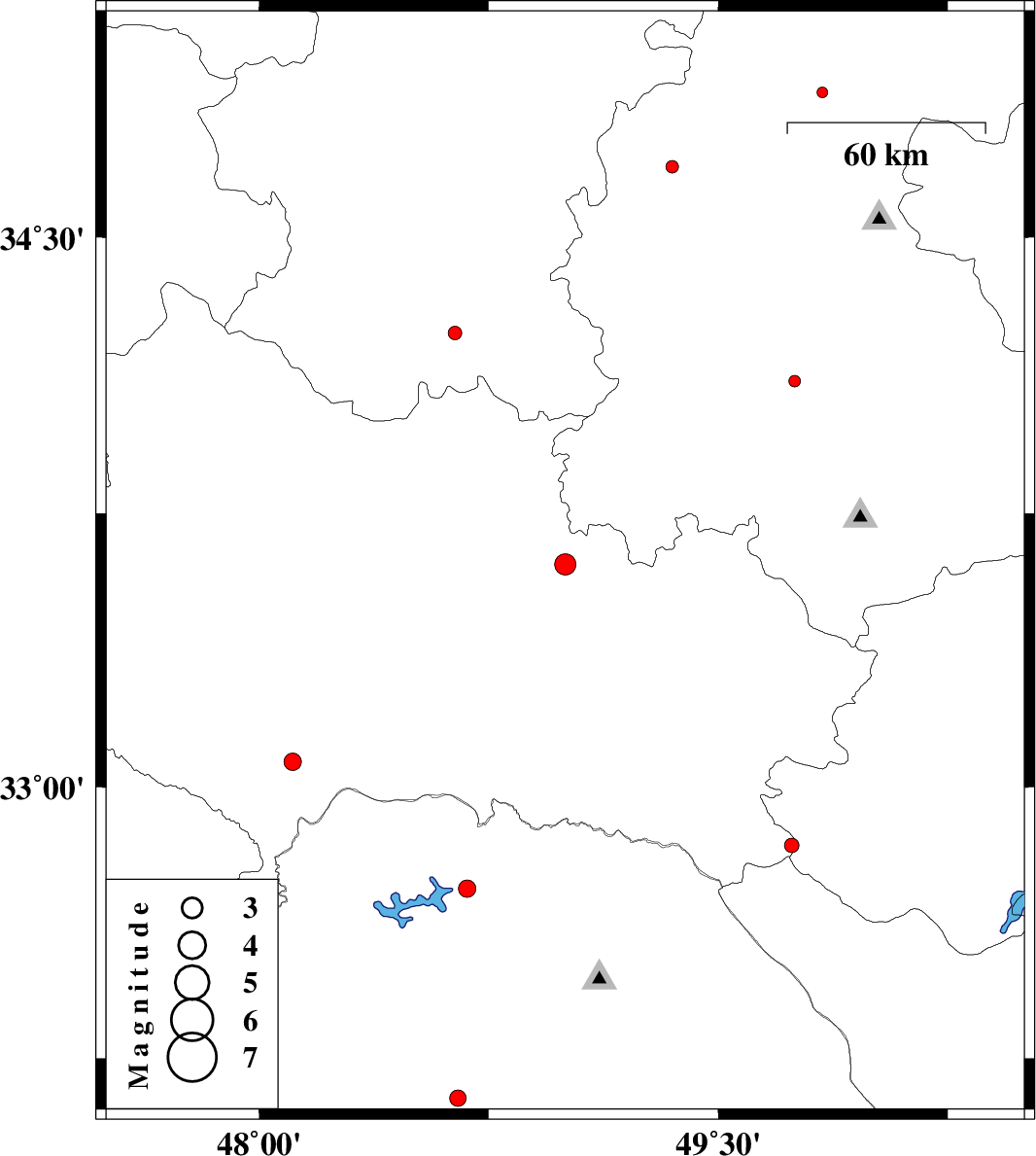 | 2013/06/14 | 17:59:58.1 | 22:29:58.1 | 33.61 | 49 | 22 | ML:3.1 | Lorestan Province, 16 km North of Dorud | ||