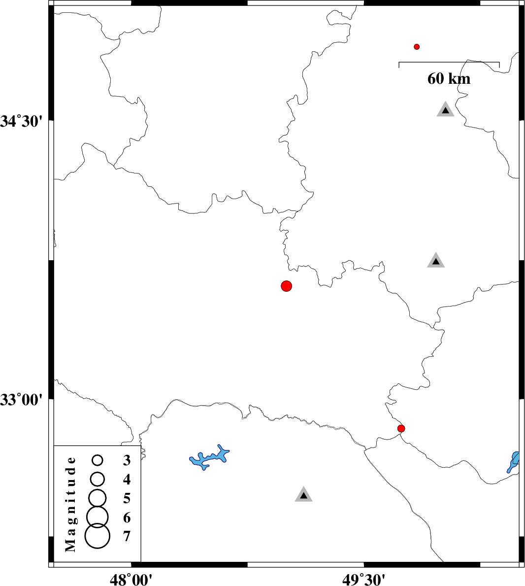 | 2013/06/07 | 00:20:49.0 | 04:50:49.0 | 32.84 | 49.74 | 6 | ML:2.1 | Lorestan Province, 36 km West of Fereydunshahr |