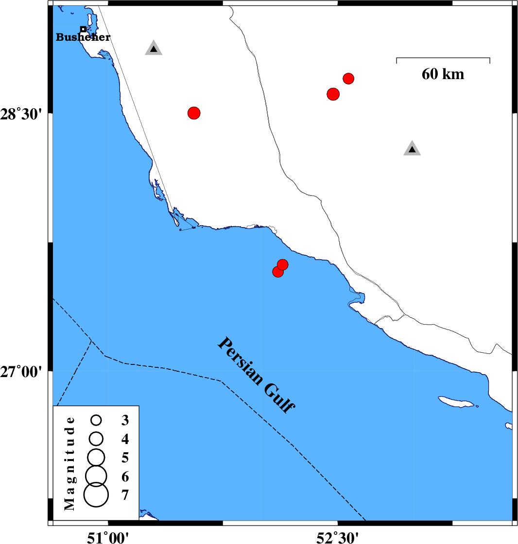 | 2013/06/14 | 21:52:23.7 | 02:22:23.7 | 27.58 | 52.11 | 15 | ML:3.3 | Persian Gulf, 28 km South of Bandar-e kangan | ||