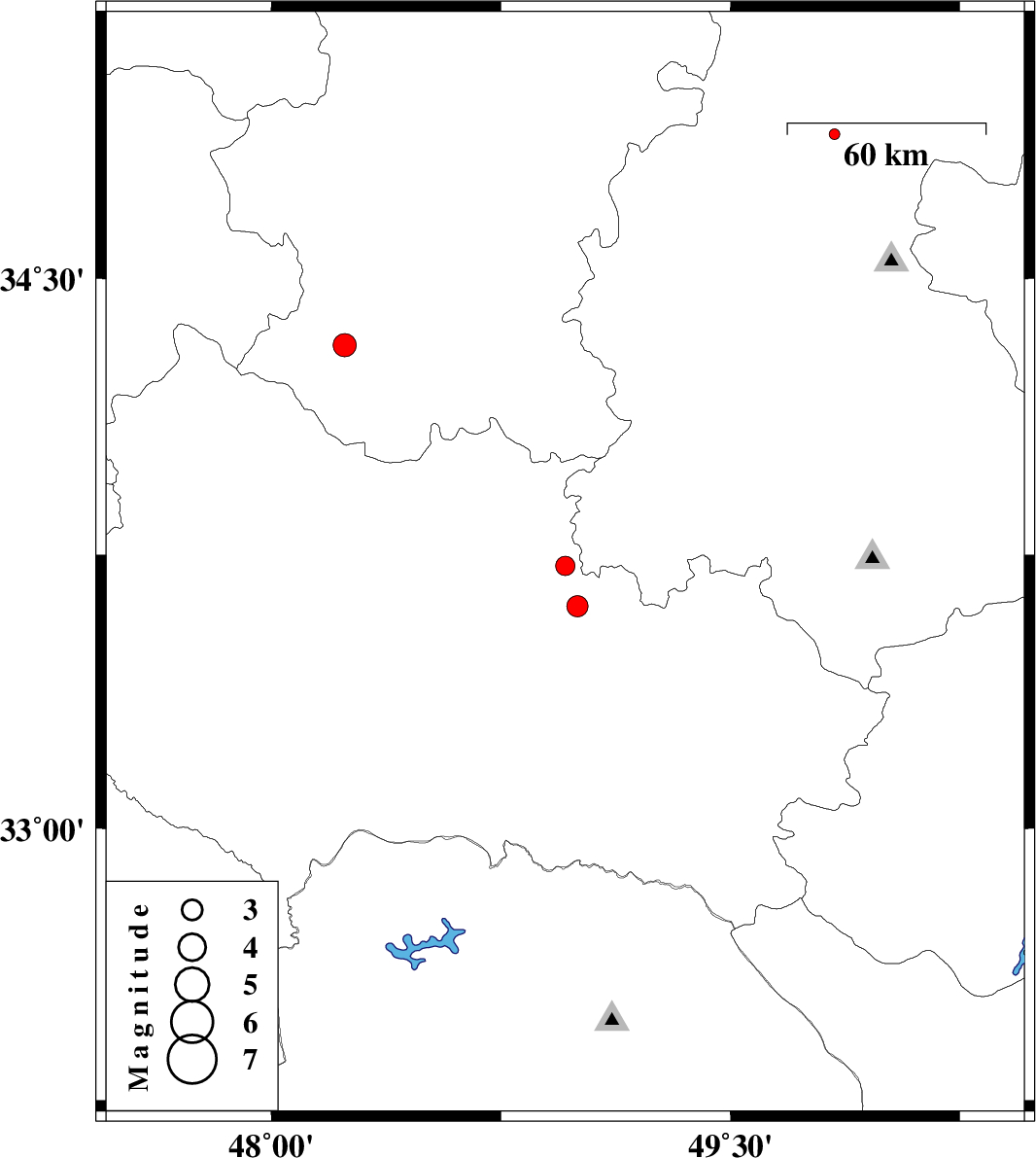 | 2013/06/17 | 02:36:16.0 | 07:06:16.0 | 33.72 | 48.96 | 11 | ML:2.8 | Lorestan Province, 28 km North-West of Dorud | ||