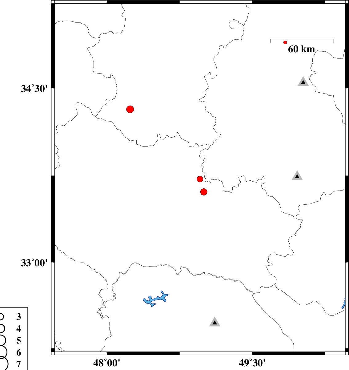 | 2013/06/14 | 17:59:58.1 | 22:29:58.1 | 33.61 | 49 | 22 | ML:3.1 | Lorestan Province, 16 km North of Dorud | ||