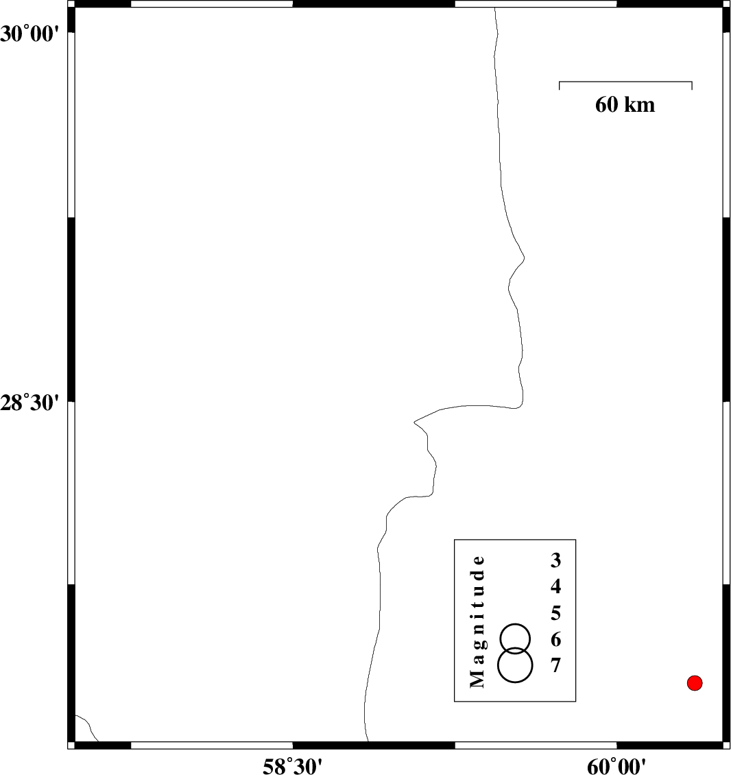 | 2013/06/18 | 21:00:56.3 | 01:30:56.3 | 28.6 | 58.99 | 14 | ML:3.1 | Kerman Province, 83 km South-East of Bam | ||