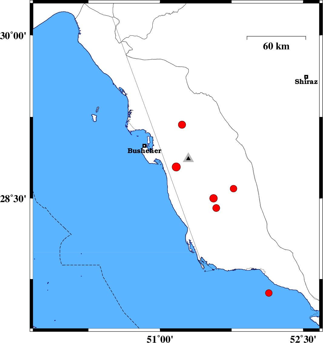 | 2013/06/22 | 17:46:22.0 | 22:16:22.0 | 28.79 | 51.17 | 42 | ML:4 | Bushehr Province, 13 km Ahram | ||