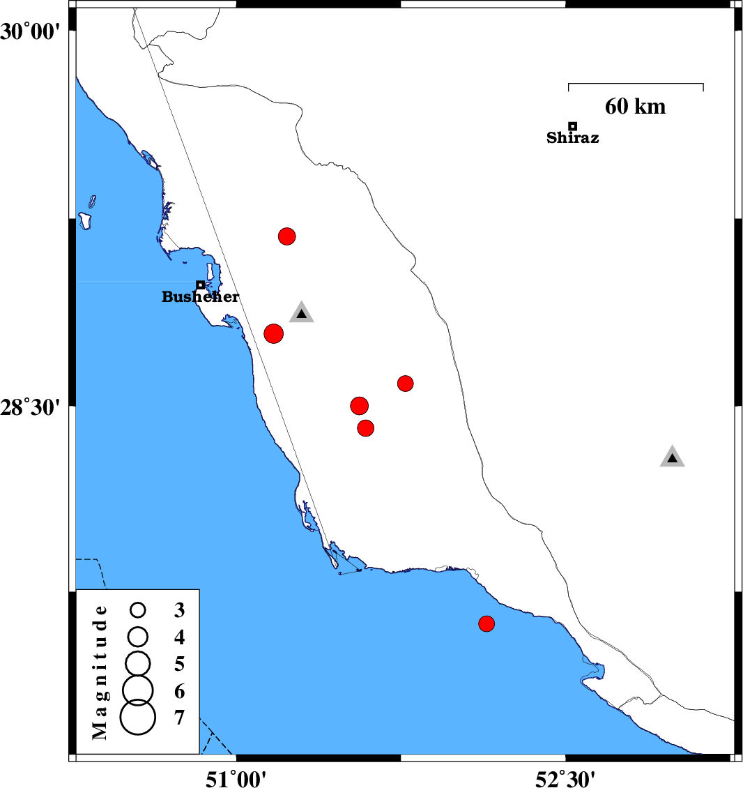| 2013/06/15 | 00:30:11.5 | 05:00:11.5 | 27.62 | 52.14 | 17 | ML:3.2 | Persian Gulf, 24 km South of Bandar-e kangan |