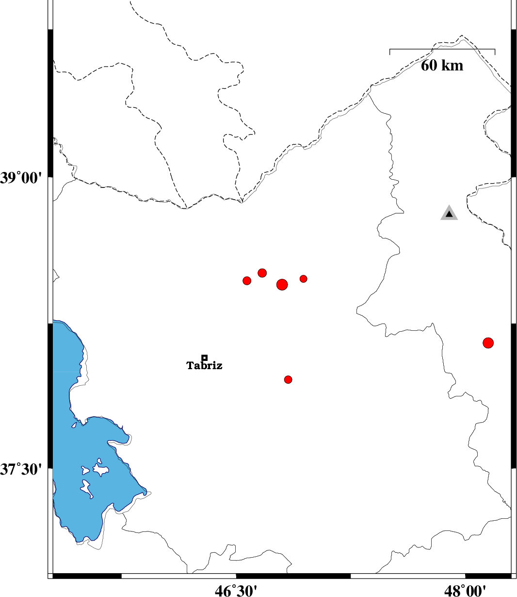 | 2013/05/29 | 08:15:27.9 | 12:45:27.9 | 37.96 | 46.84 | 14 | ML:2.3 | Azarbaijan Sharghi Province, 13 km North of Bostanabad | ||