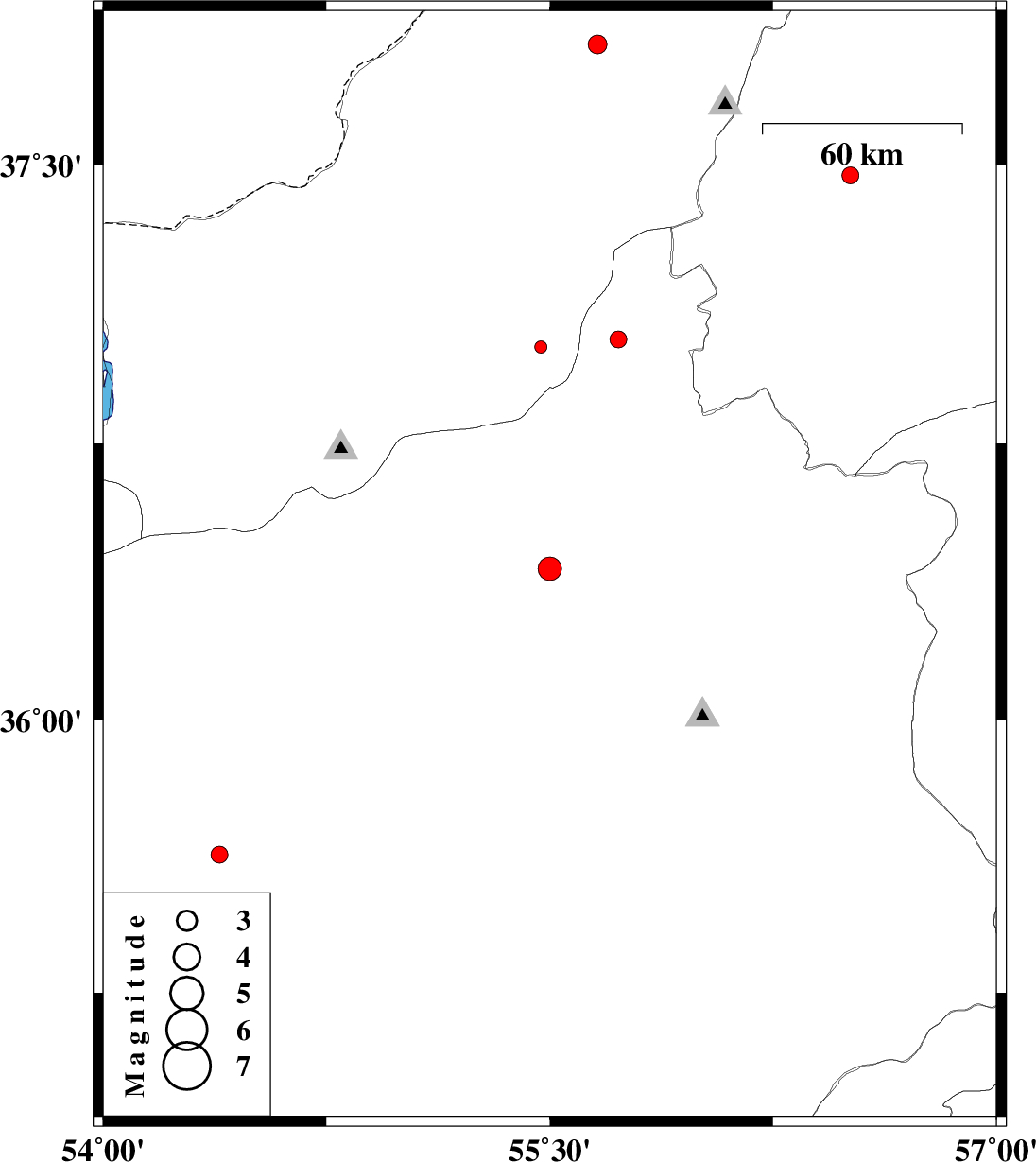 | 2013/06/04 | 22:33:02.0 | 03:03:02.0 | 37.82 | 55.66 | 17 | ML:2.8 | Golestan Province, 51 km North-East of Kalaleh | ||