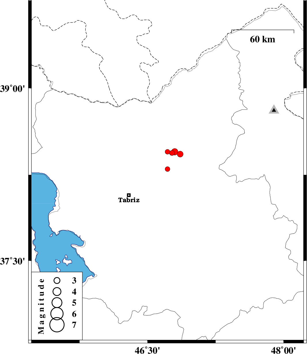 | 2013/06/27 | 21:22:49.7 | 01:52:49.7 | 38.3 | 46.72 | 14 | ML:2.4 | Azarbaijan Sharghi Province, 35 km West of Haris | ||