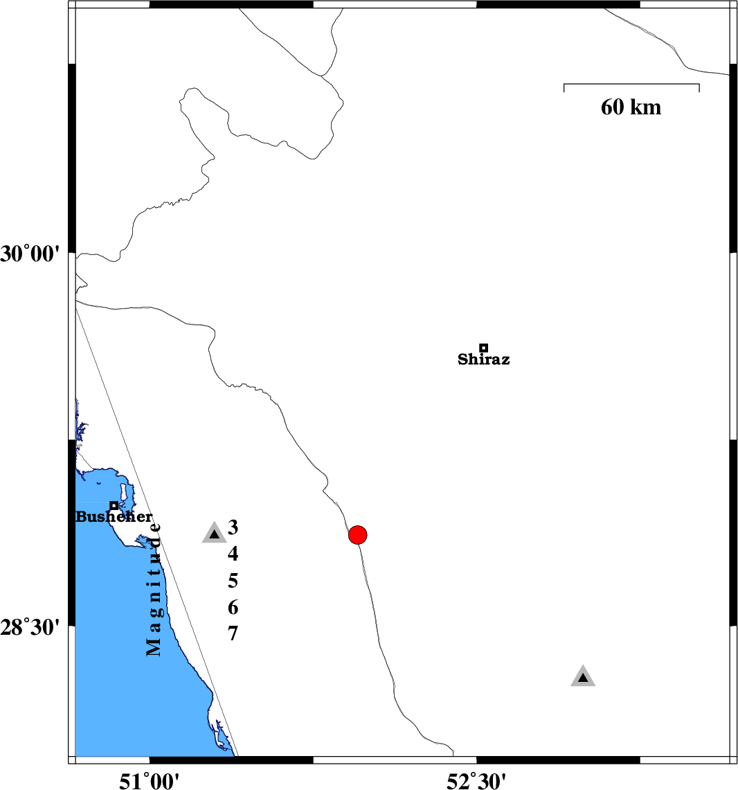 | 2013/06/30 | 22:01:46.3 | 02:31:46.3 | 29.47 | 52.16 | 14 | ML:3 | Fars Province, 40 km South-West of Shiraz | ||