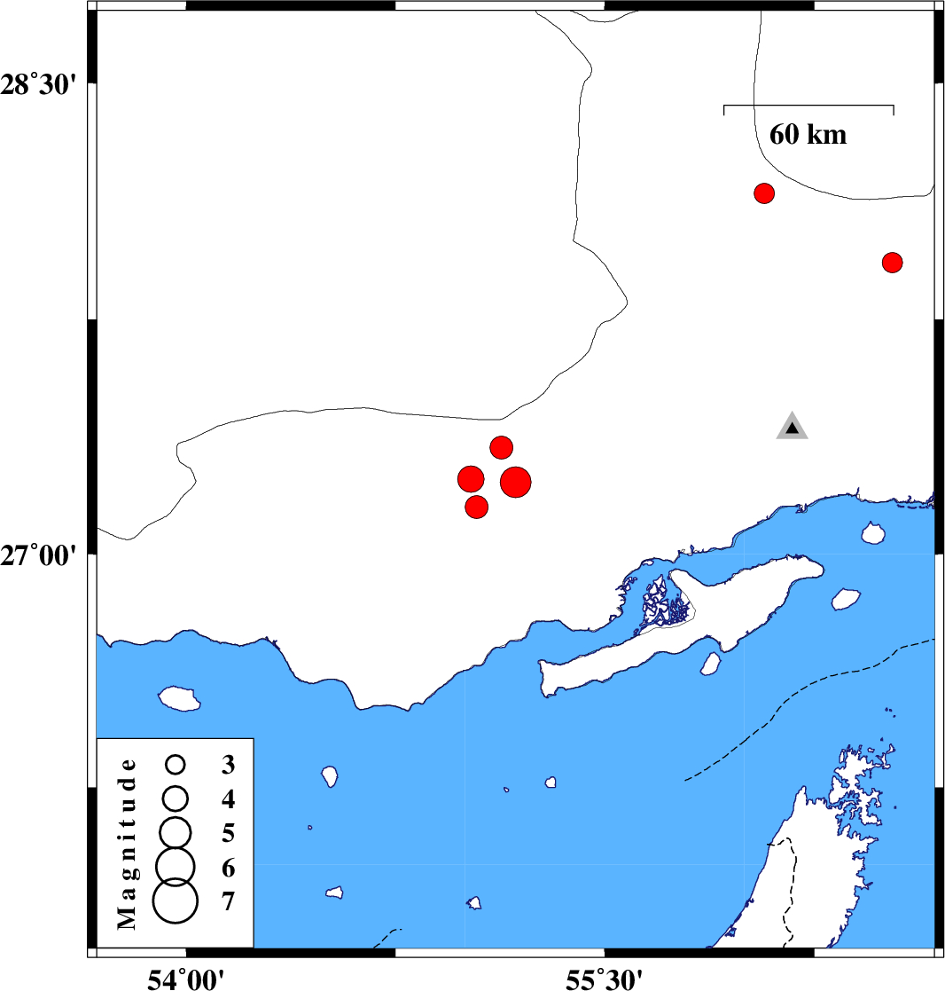 | 2013/06/07 | 19:06:14.2 | 23:36:14.2 | 28.15 | 56.07 | 14 | ML:3.2 | Hormozgan Province, 24 km South-East of Hajiabad |