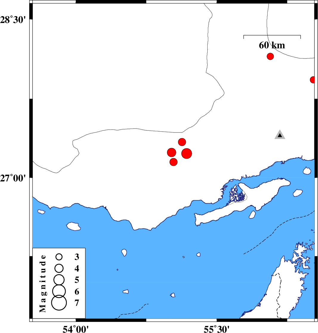 | 2013/06/07 | 19:06:14.2 | 23:36:14.2 | 28.15 | 56.07 | 14 | ML:3.2 | Hormozgan Province, 24 km South-East of Hajiabad |