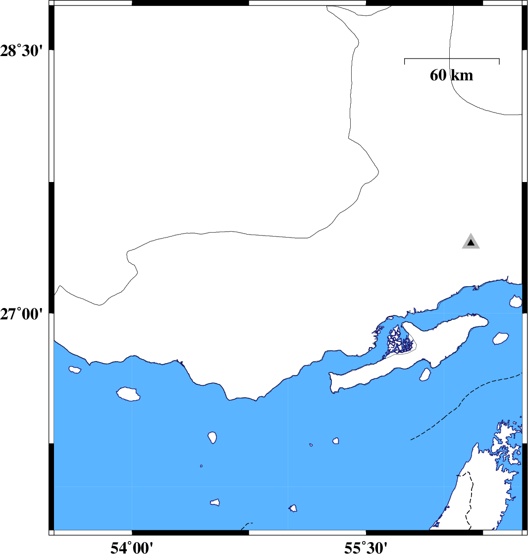 | 2013/07/02 | 16:04:42.4 | 20:34:42.4 | 27.15 | 55.04 | 14 | ML:3.6 | Hormozgan Province, 67 km East of Bastak | ||
