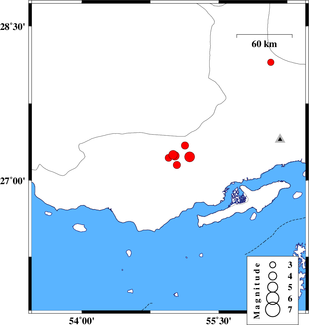 | 2013/07/02 | 16:04:42.4 | 20:34:42.4 | 27.15 | 55.04 | 14 | ML:3.6 | Hormozgan Province, 67 km East of Bastak | ||