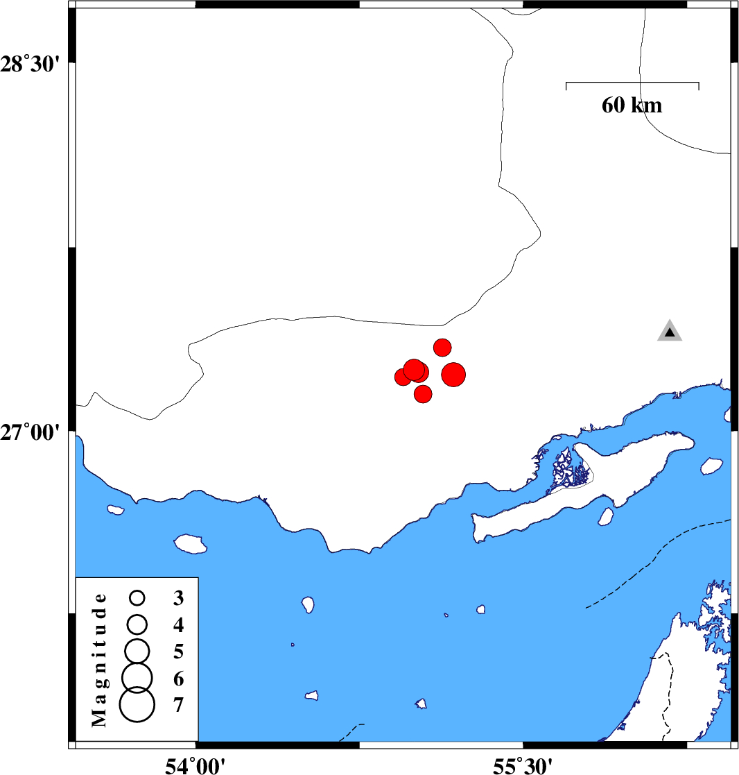 | 2013/07/02 | 16:04:42.4 | 20:34:42.4 | 27.15 | 55.04 | 14 | ML:3.6 | Hormozgan Province, 67 km East of Bastak | ||