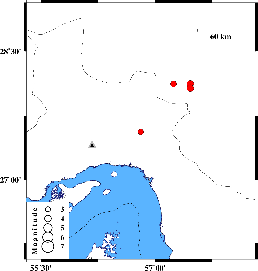 | 2013/07/08 | 10:24:46.9 | 14:54:46.9 | 27.56 | 56.81 | 18 | ML:3.2 | Hormozgan Province, 44 km North-West of Dehbarez | ||