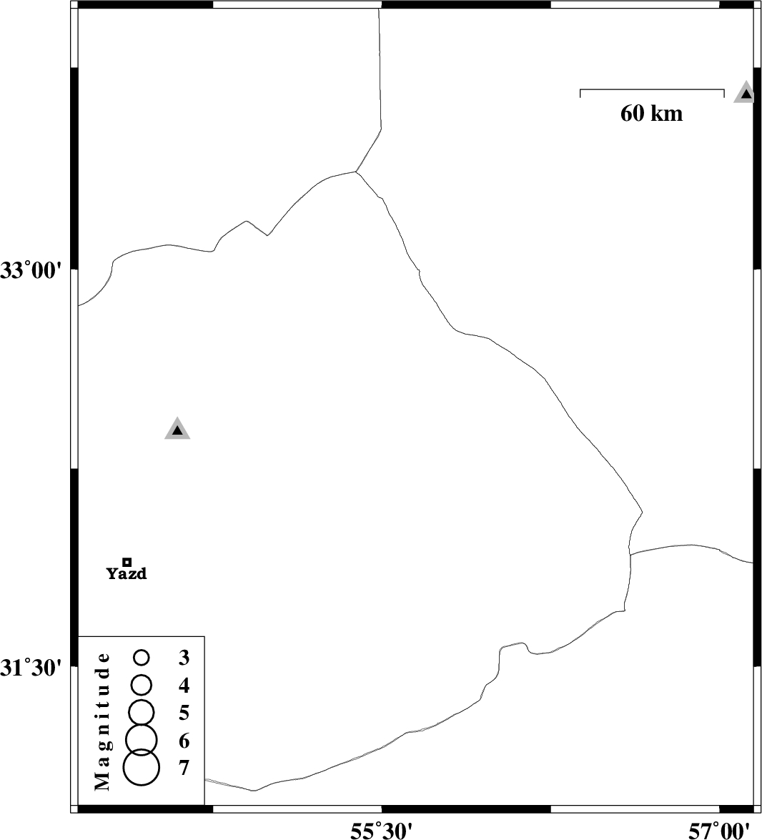 | 2013/07/09 | 01:26:32.9 | 05:56:32.9 | 32.47 | 55.65 | 15 | ML:3.4 | Yazd Province, 100 km North-East of Bafq |
