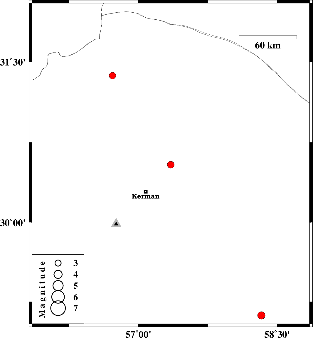 | 2013/06/26 | 19:05:04.3 | 23:35:04.3 | 31.37 | 56.72 | 14 | ML:3.2 | Kerman Province, 14 km Ravar | ||