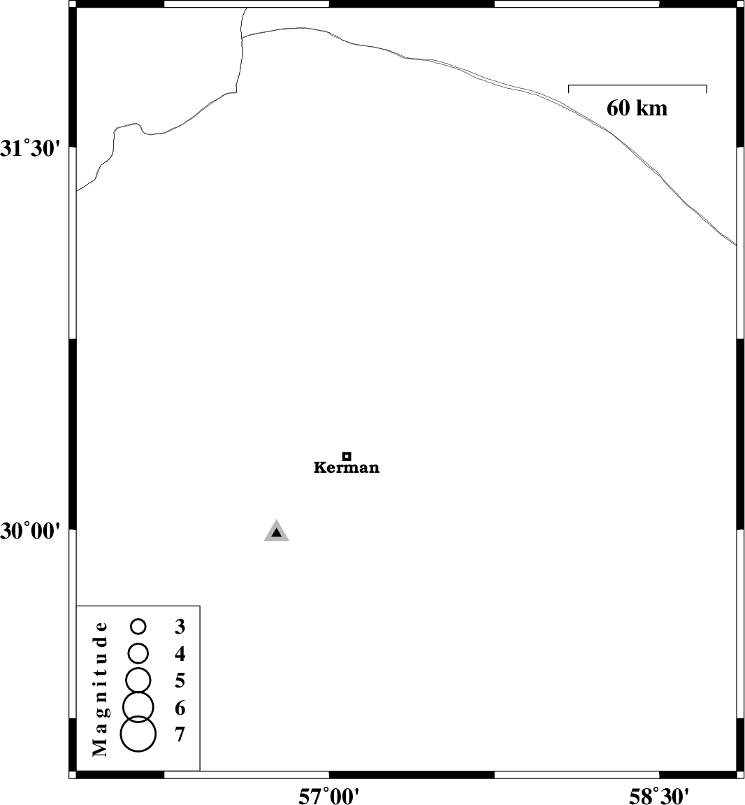 | 2013/07/10 | 23:53:34.8 | 04:23:34.8 | 30.54 | 57.35 | 14 | ML:3.4 | Kerman Province, 39 km North-East of Kerman |