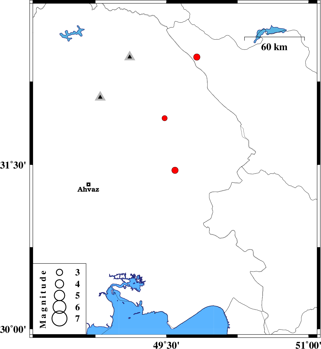 | 2013/07/08 | 00:30:57.8 | 05:00:57.8 | 30.57 | 48.22 | 17 | ML:2.9 | Khoozestan Province, 16 km North of Khorramshahr |