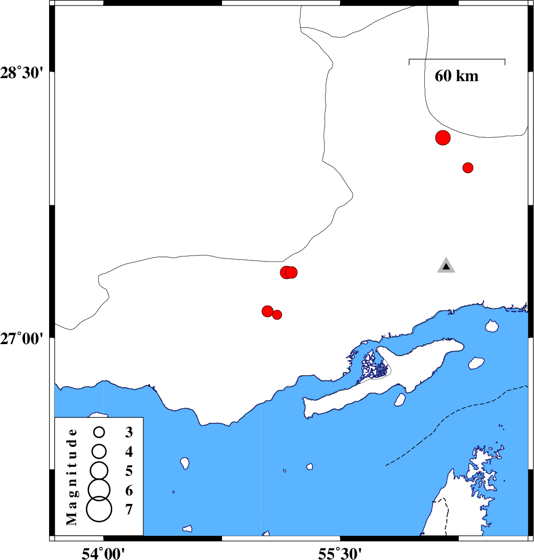 | 2013/07/07 | 09:15:37.3 | 13:45:37.3 | 27.15 | 55.04 | 29 | ML:3.2 | Hormozgan Province, 67 km East of Bastak |