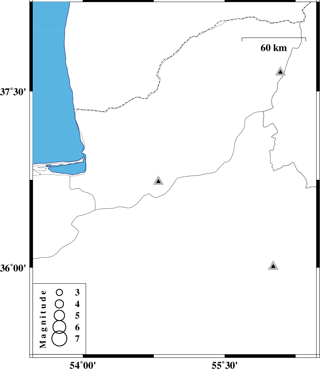 | 2013/07/15 | 00:23:25.8 | 04:53:25.8 | 36.75 | 54.97 | 18 | ML:3.1 | Golestan Province, 19 km South-East of Ali Abad |