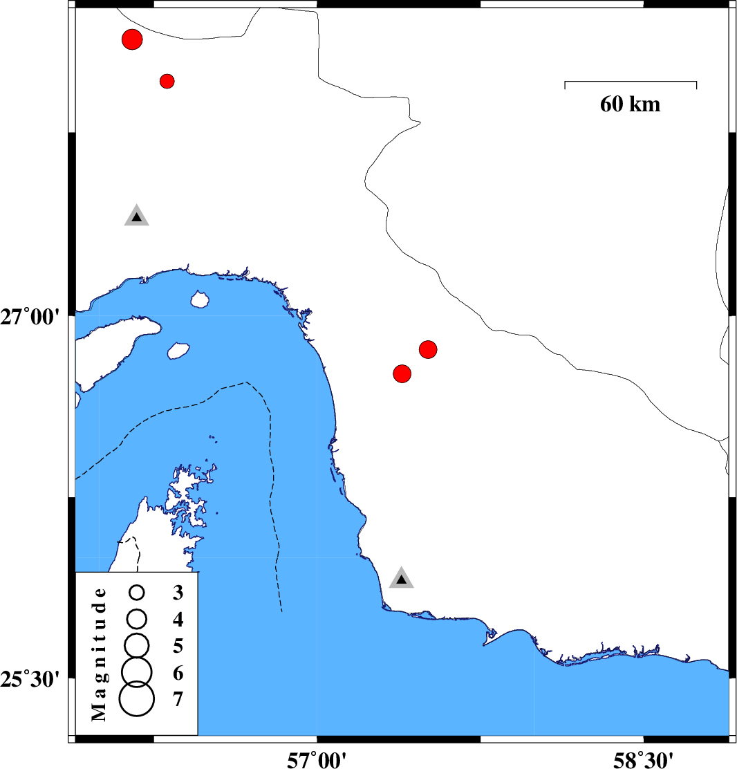 | 2013/07/16 | 06:49:57.3 | 11:19:57.3 | 26.76 | 57.39 | 18 | ML:3.7 | Hormozgan Province, 53 km South-East of Minab | ||