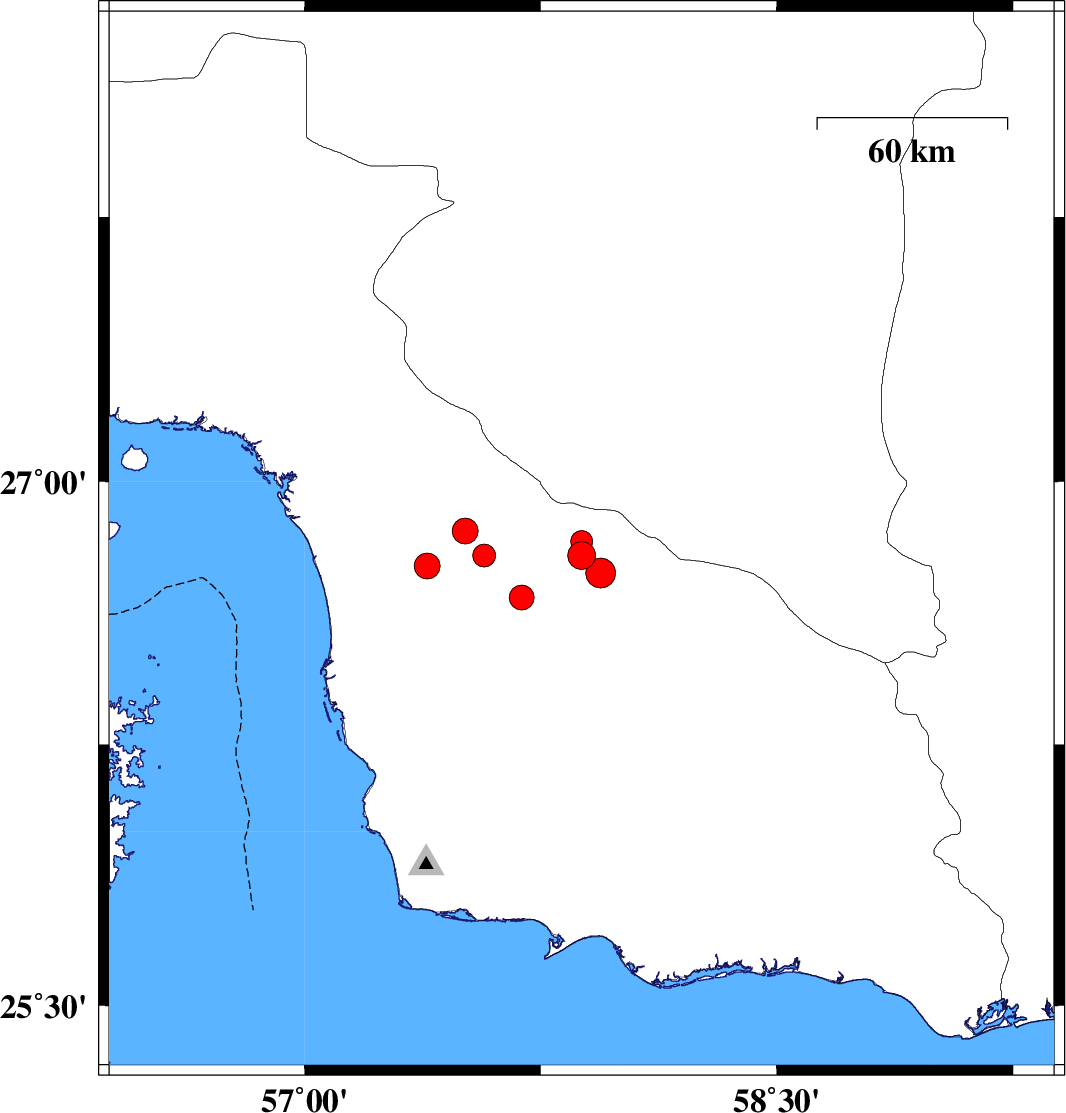 2013/07/18 04:55:27.4 09:25:27.4 26.7957.8815 ML:4 Hormozgan Province, 79 km South-East of Manujan