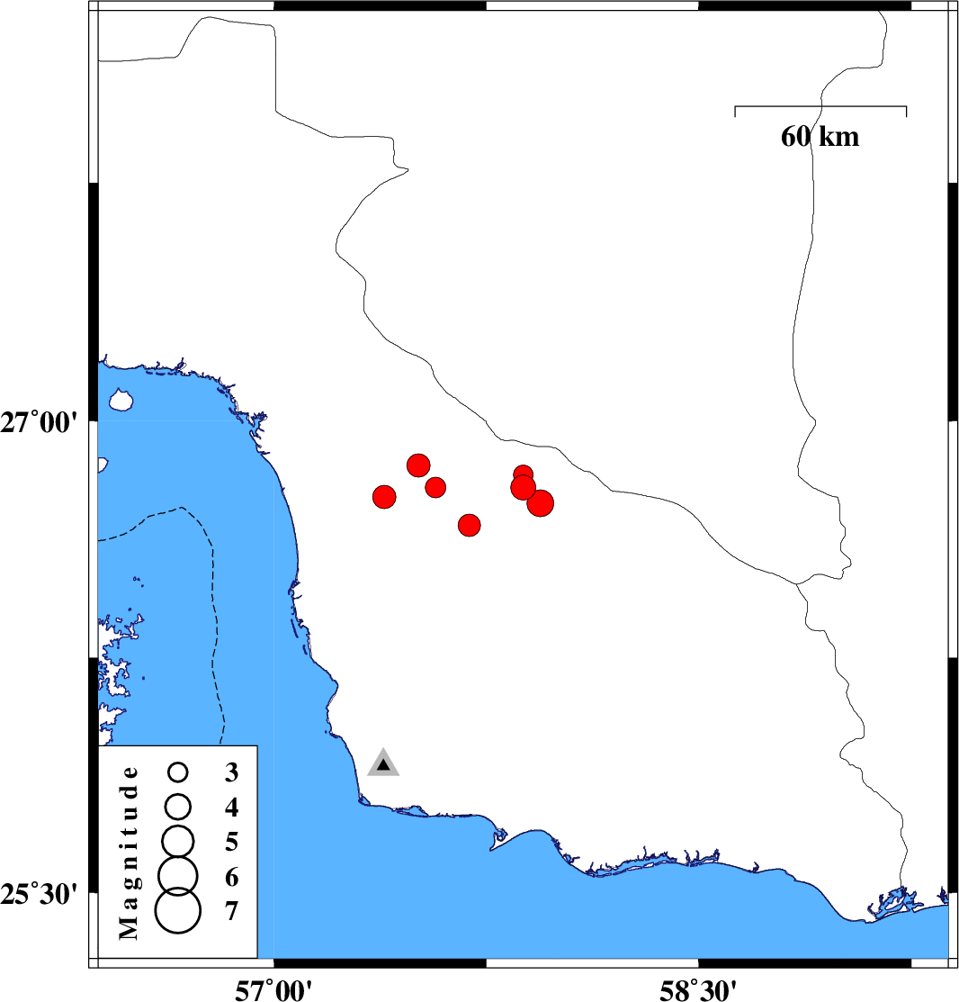| 2013/07/16 | 06:49:57.3 | 11:19:57.3 | 26.76 | 57.39 | 18 | ML:3.7 | Hormozgan Province, 53 km South-East of Minab | ||