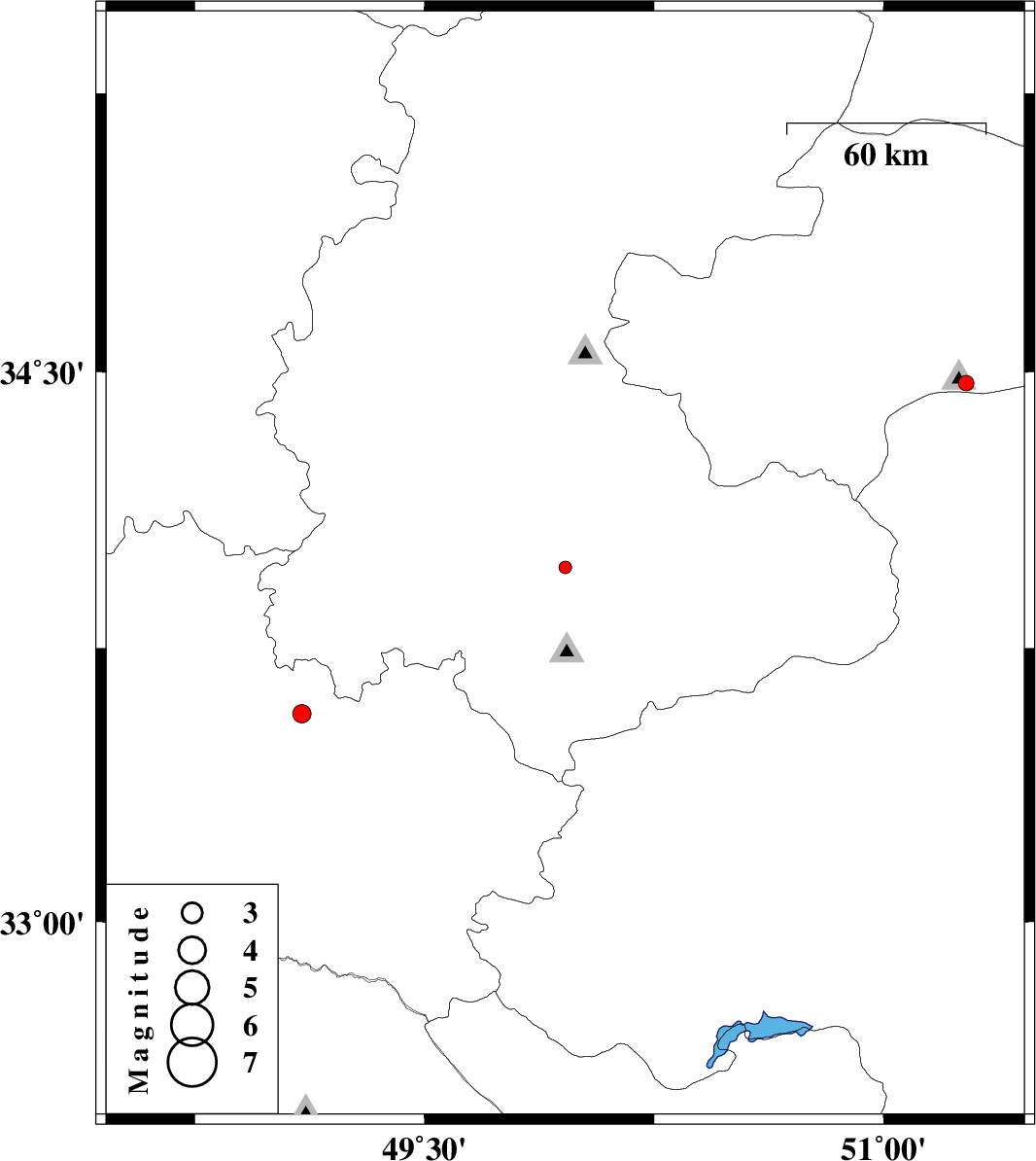 | 2013/07/18 | 09:40:16.2 | 14:10:16.2 | 33.97 | 49.96 | 9 | ML:1.8 | Markazi Province, 28 km South-East of Arak | ||