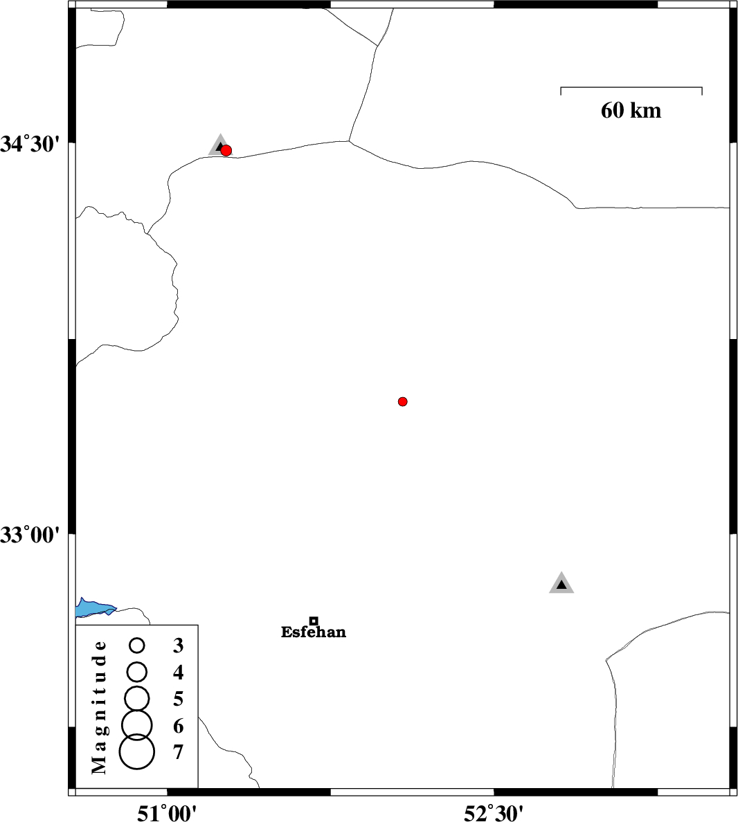 | 2013/07/18 | 09:46:22.2 | 14:16:22.2 | 33.51 | 52.08 | 6 | ML:1.9 | Esfahan Province, 16 km East of Natanz | ||