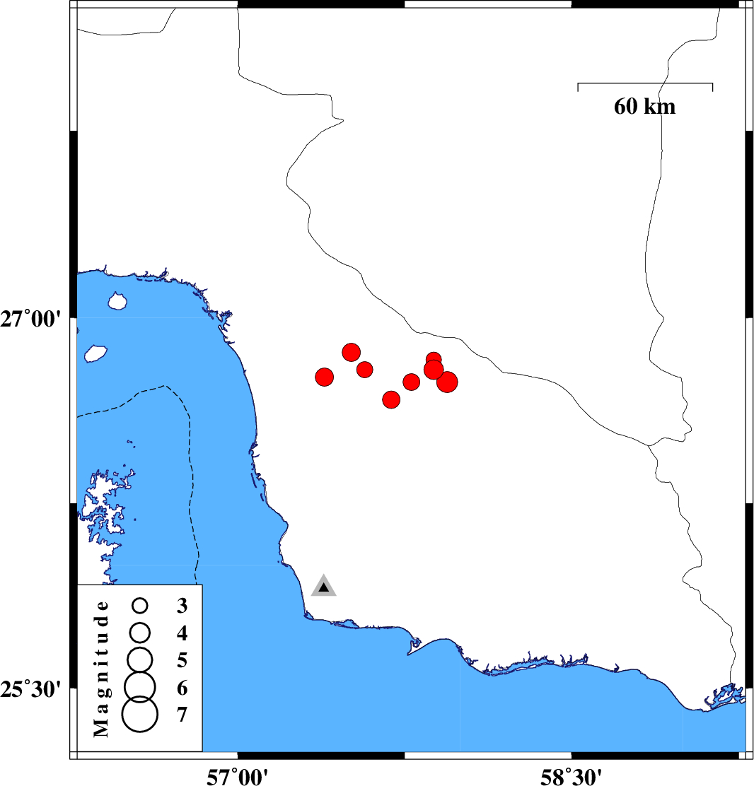 | 2013/07/18 | 04:04:30.9 | 08:34:30.9 | 26.83 | 57.88 | 18 | ML:3.1 | Hormozgan Province, 75 km South-East of Manujan | ||