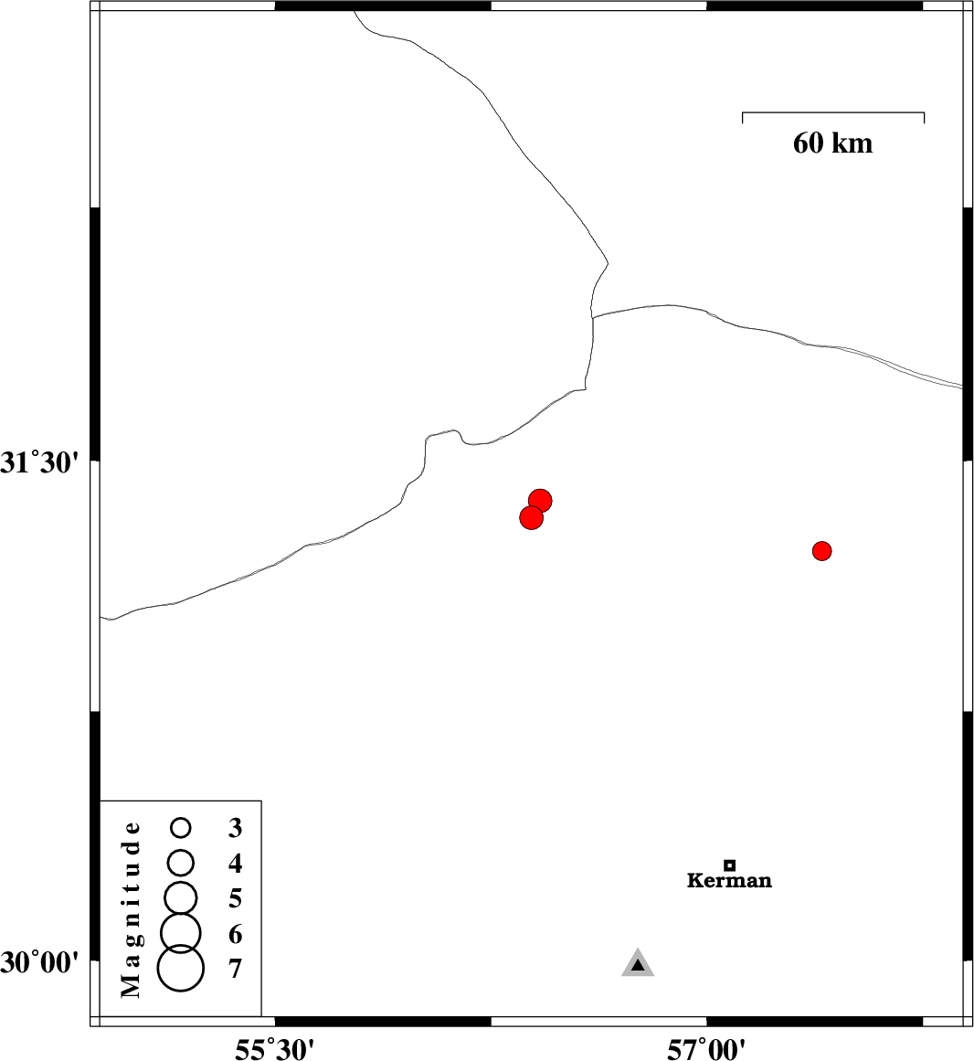 | 2013/07/19 | 23:26:42.1 | 03:56:42.1 | 31.33 | 56.39 | 15 | ML:3.6 | Kerman Province, 41 km West of Ravar | ||