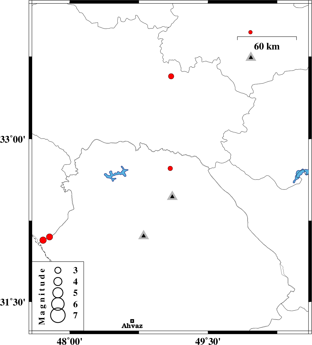 | 2013/07/18 | 00:42:41.8 | 05:12:41.8 | 32.07 | 47.71 | 14 | ML:3.3 | Khoozestan Province, 53 km South-West of Shush |