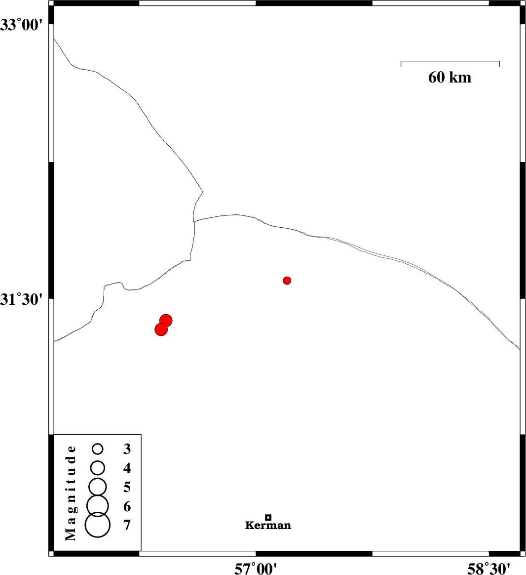 | 2013/07/19 | 21:24:42.7 | 01:54:42.7 | 31.38 | 56.42 | 14 | ML:3.6 | Kerman Province, 40 km North-West of Ravar |