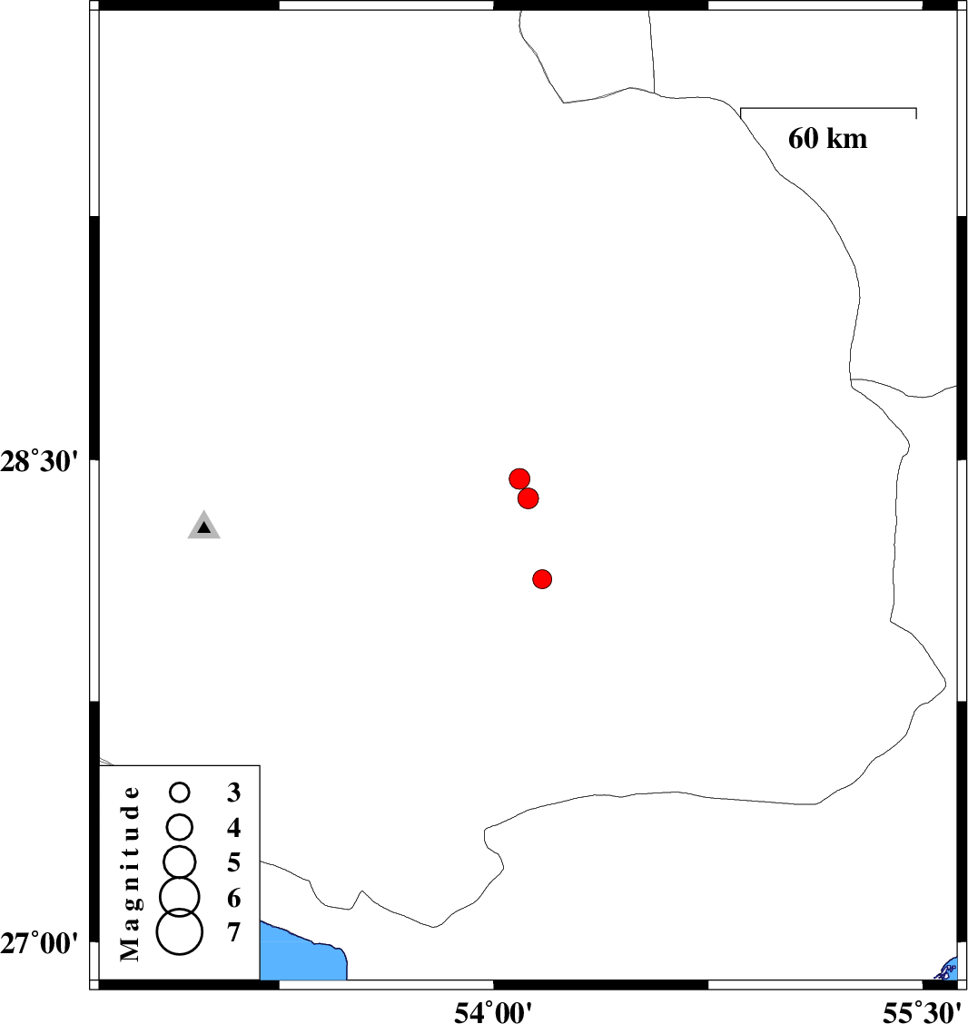 | 2013/07/23 | 07:44:21.2 | 12:14:21.2 | 28.38 | 54.12 | 18 | ML:3.2 | Fars Province, 57 km South-East of Jahrom | ||