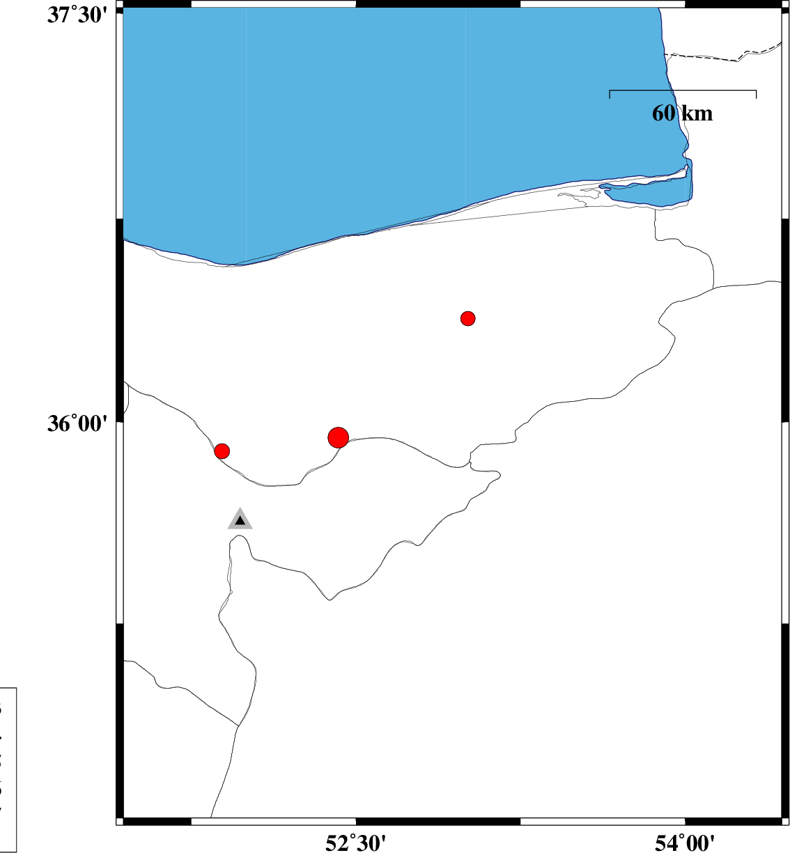 | 2013/07/24 | 08:04:53.1 | 12:34:53.1 | 36.02 | 52.94 | 14 | ML:3.1 | Mazandaran Province, 15 km West of Pol-E-Sefid | ||