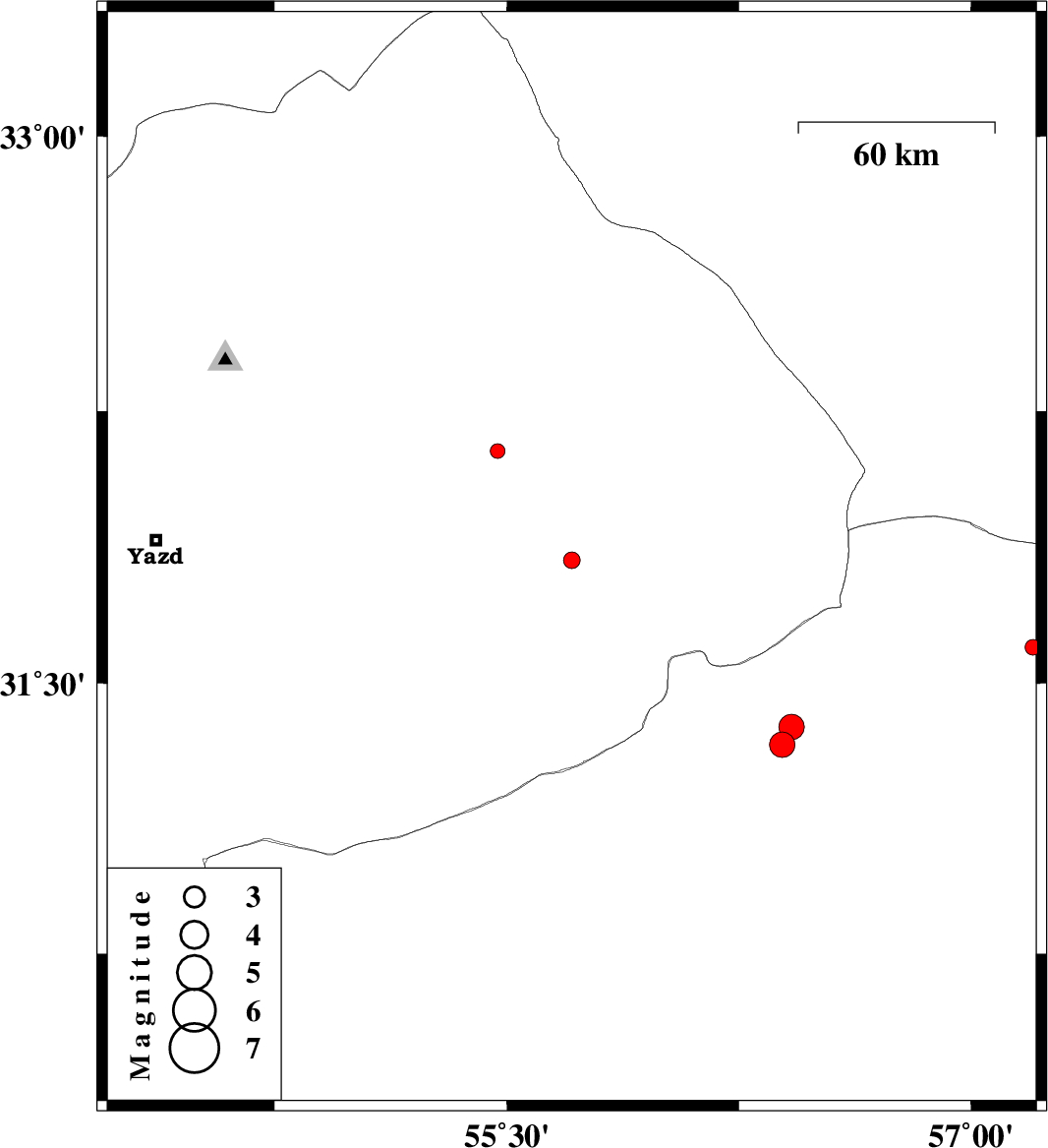 | 2013/07/26 | 11:40:32.1 | 16:10:32.1 | 32.14 | 55.47 | 14 | ML:2.1 | Yazd Province, 60 km North of Bafq | ||