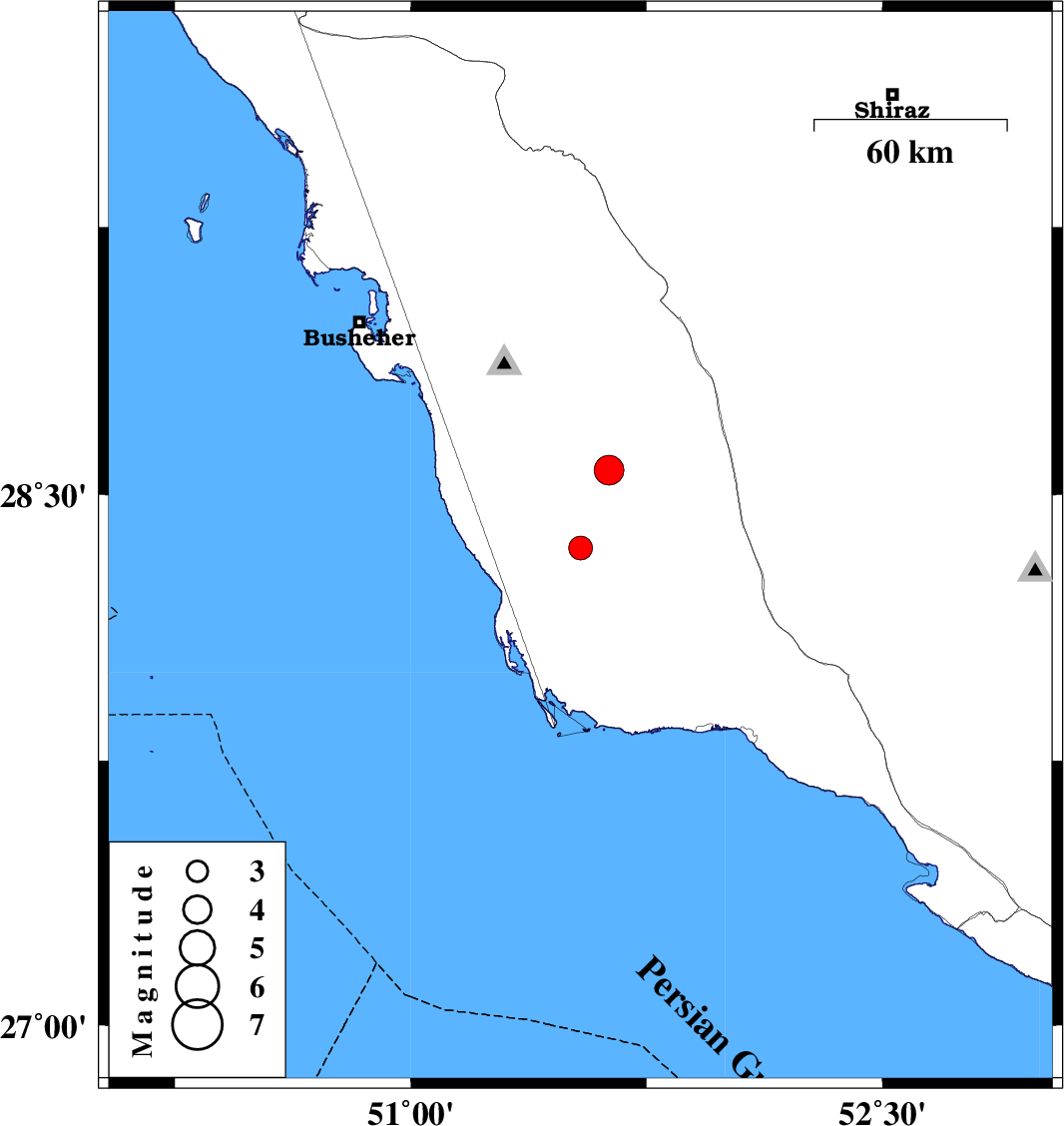 | 2013/07/26 | 12:44:44.8 | 17:14:44.8 | 28.35 | 51.54 | 27 | ML:3.4 | Bushehr Province, 37 km South-East of Khormog | ||