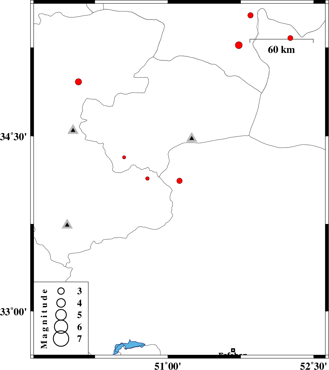 2013/07/22 | 18:11:55.5 | 22:41:55.5 | 34.96 | 50.08 | 14 | ML:2.9 | Markazi Province, 30 km North of Tafresh |